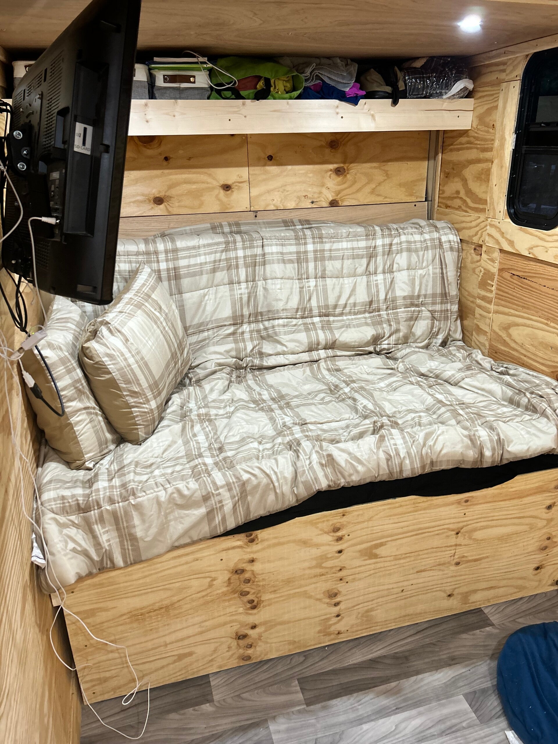 We built a counter with lower storage, a wall cabinet, and a couch that converts to a camper queen bed for us and the dogs. There’s also a shelf for clothing and bedding.