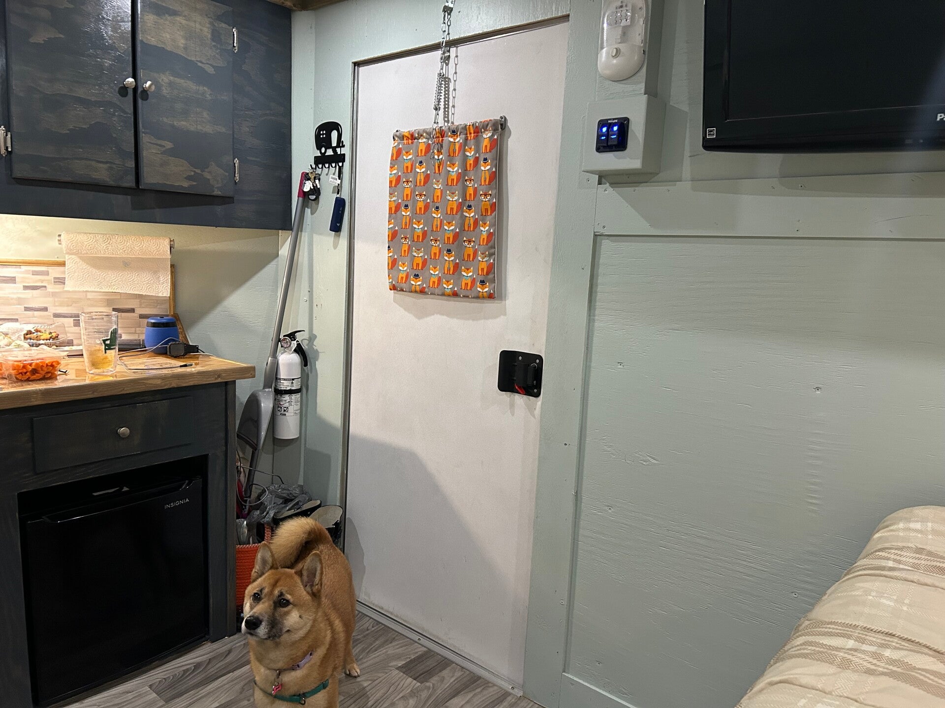 The rear “garage” area is accessible only when the barn doors are open. That way, we can get to our outdoor gear and fencing for Monty and Gadget without risking dog escapes.
