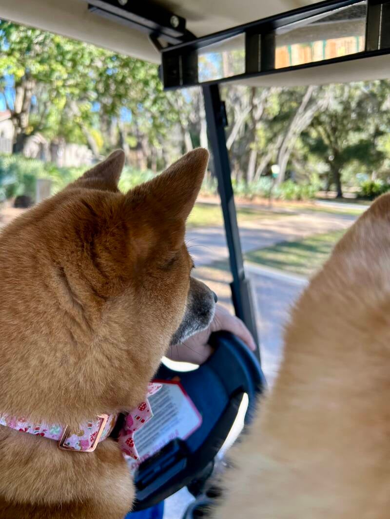 Of course, one of the real highlights was the golf carting culture. Monty and Gadget became pros at “looping” — cruising around the campground in the cart, and noses in the wind. They loved checking out the elaborate holiday decorations still on display at many campsites just after Christmas and were equally fascinated when we rode past the brand-new cabin installations. The golf carting quickly became part of our daily routine, and honestly, we think the Shibas would’ve voted it the best attraction in all of Walt Disney World.
